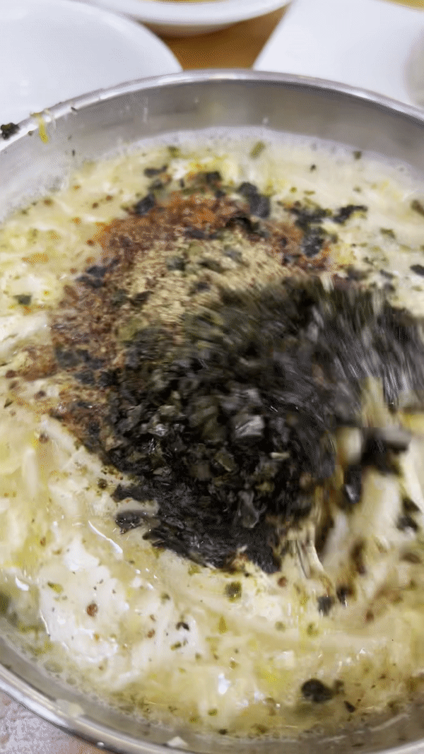 채수 베이스 + 걸쭉한 계란 국물 + 들깨 + 고춧가루 + 김가루