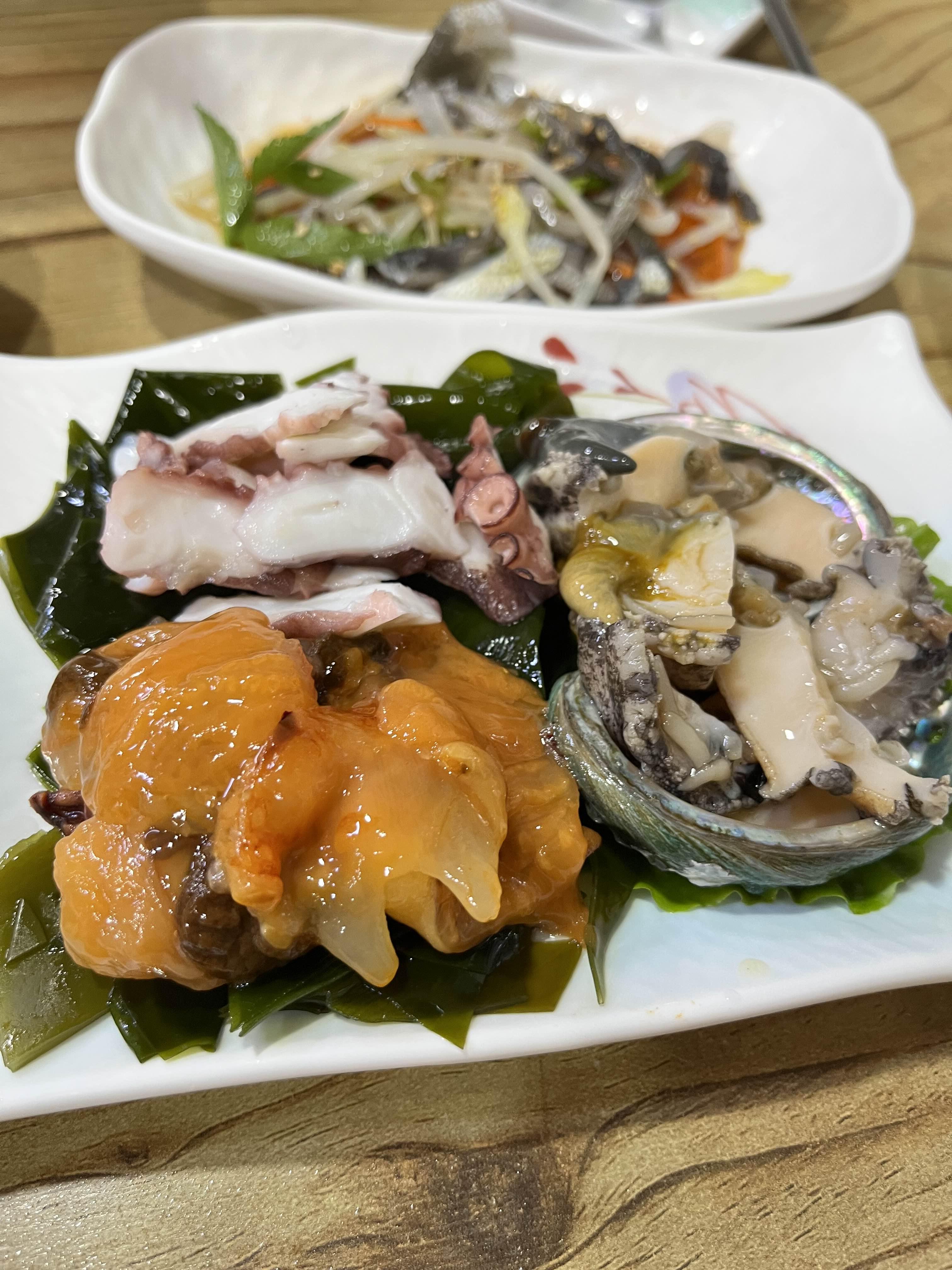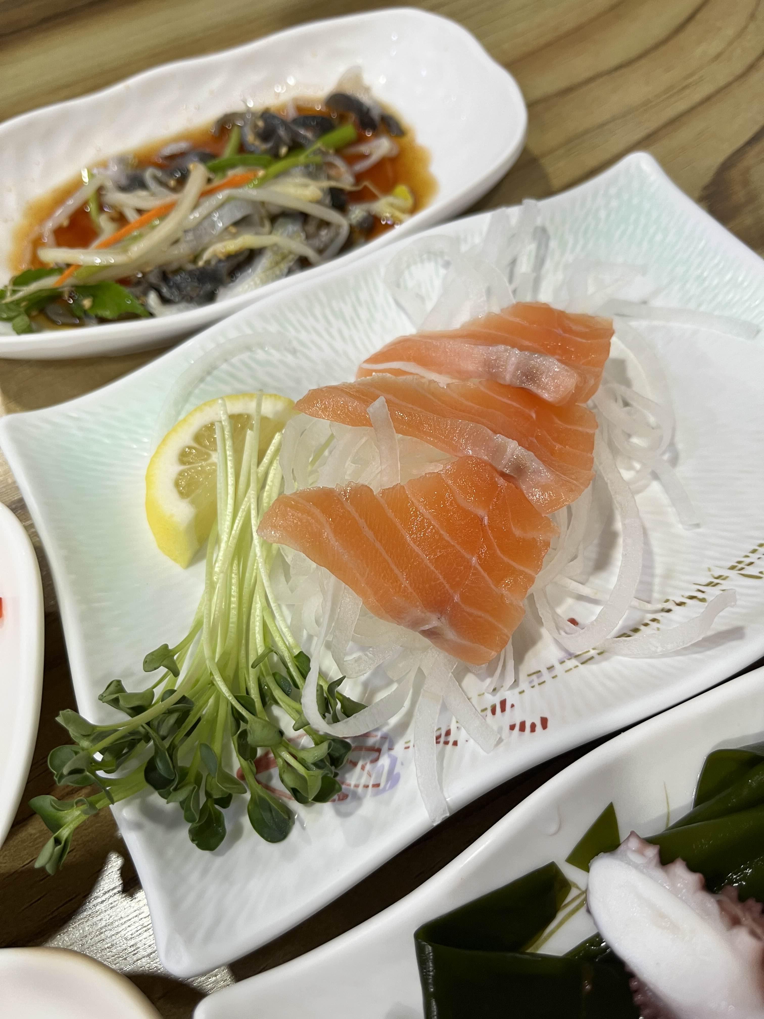 연어 , 배추쌈 + 젓갈 , 전복, 멍게 , 문어