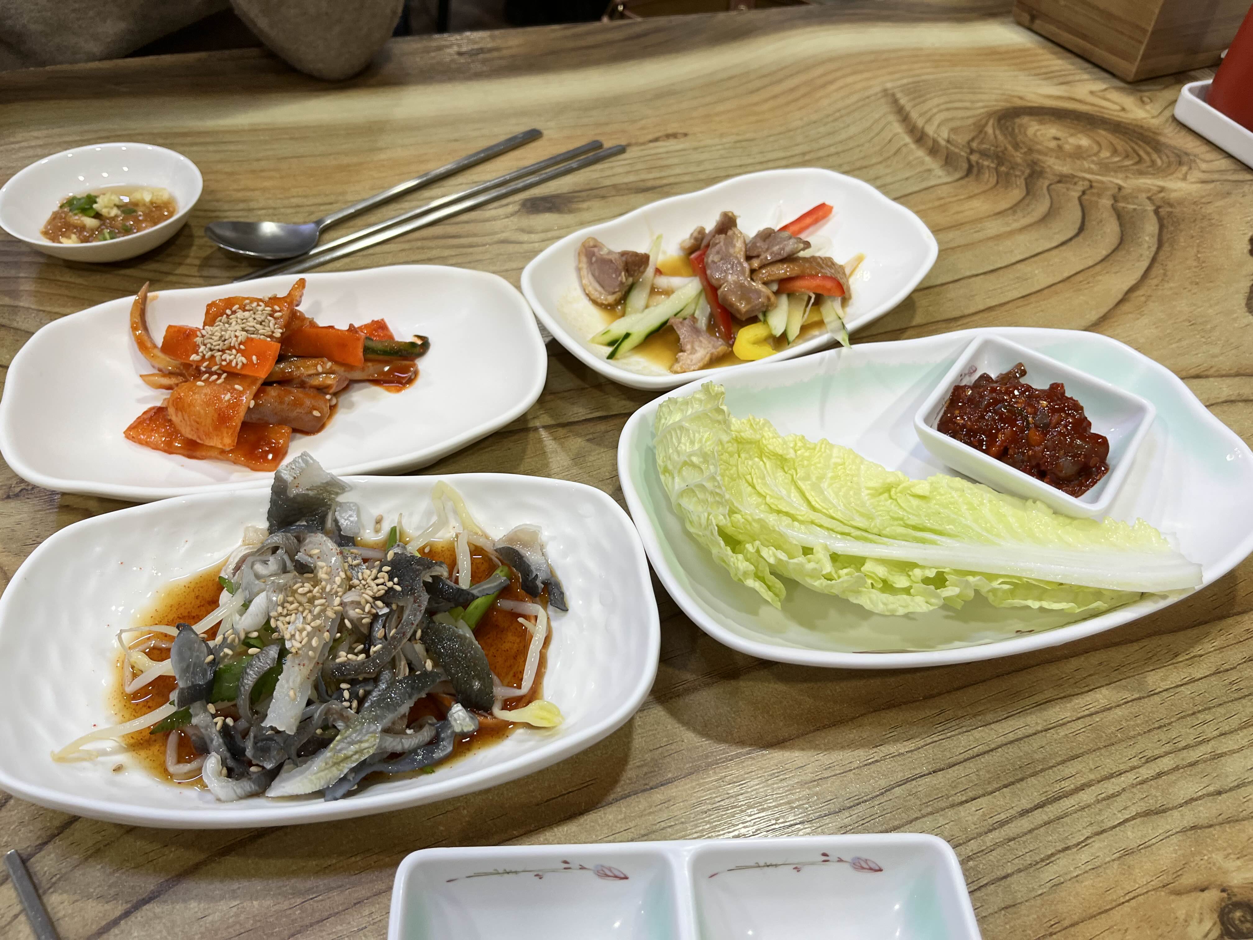 기본 쌈장에, 복껍질 무침, 오리고기,