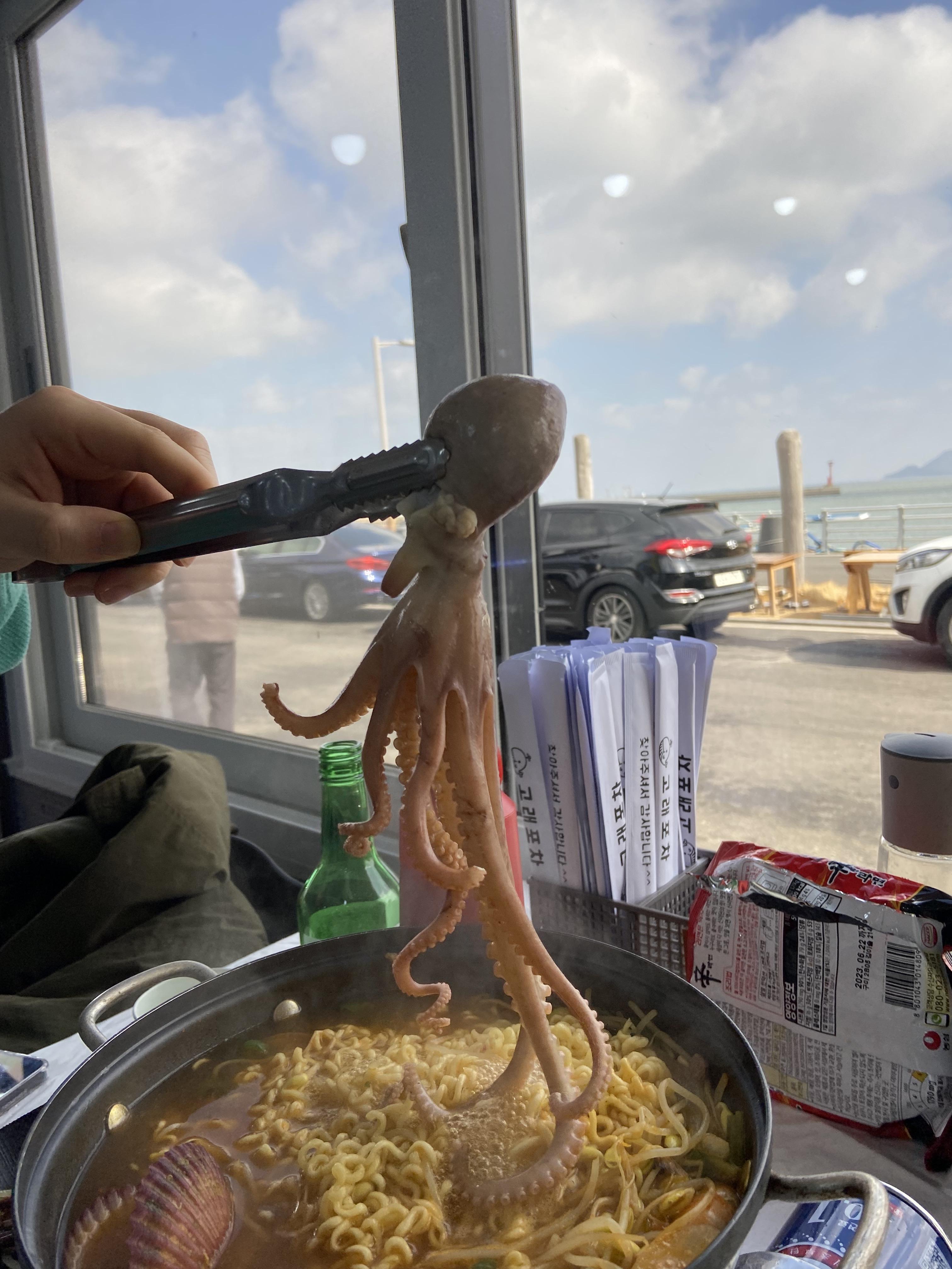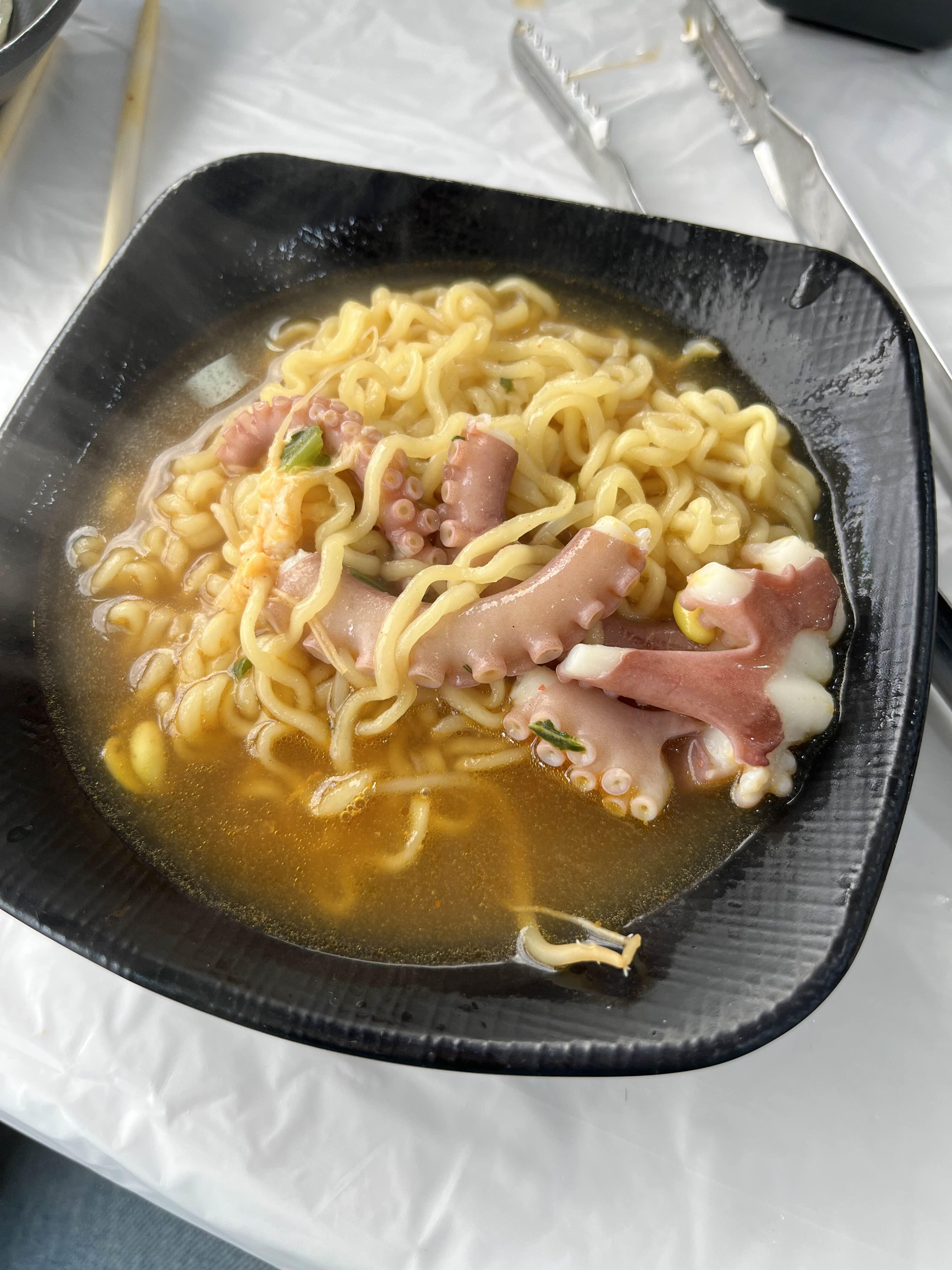 라면을 가져다 주시면서, 라면스프+면 을 넣고 조금 끓이면 낙지 한마리 넣어주신다고 하셨어요~!